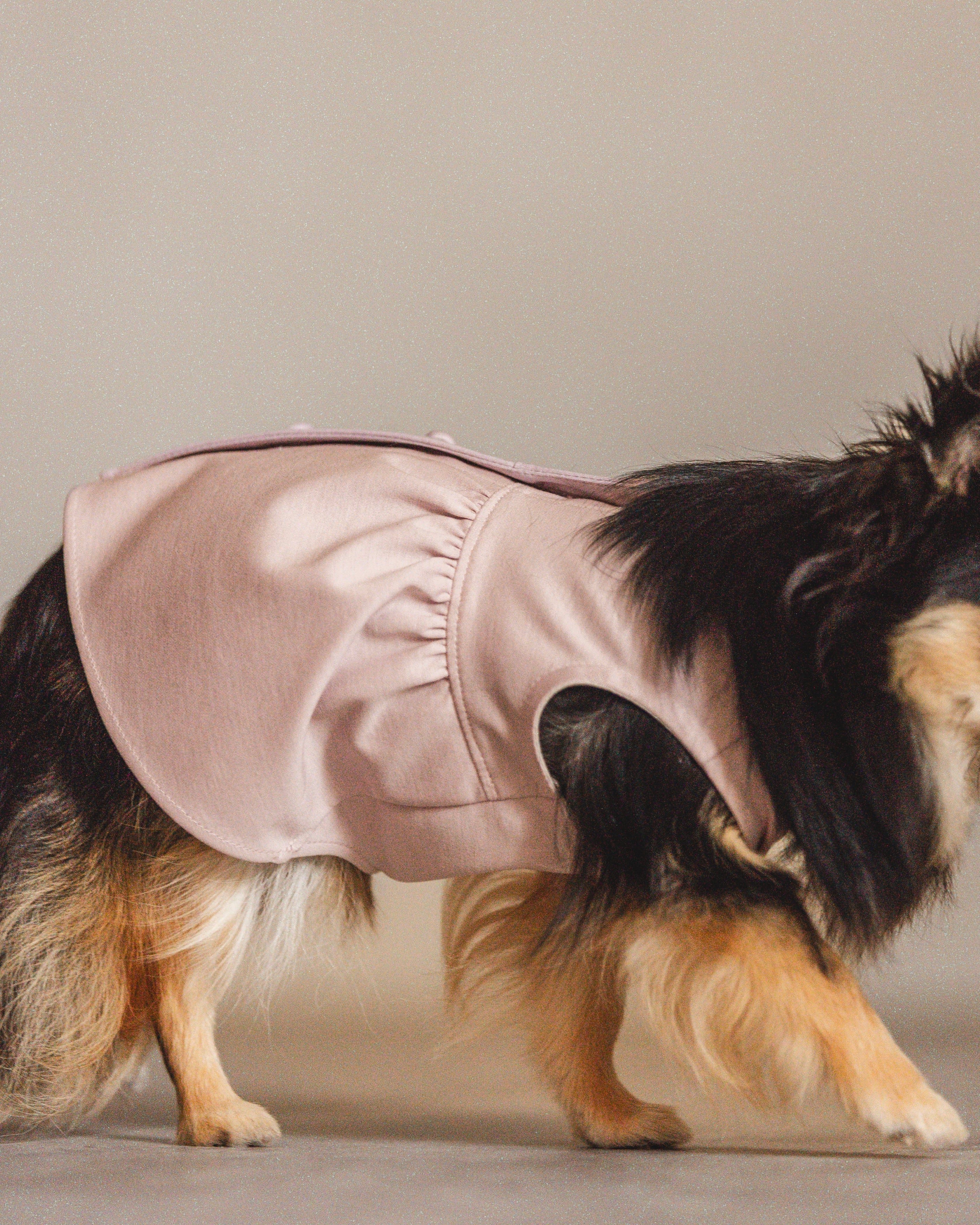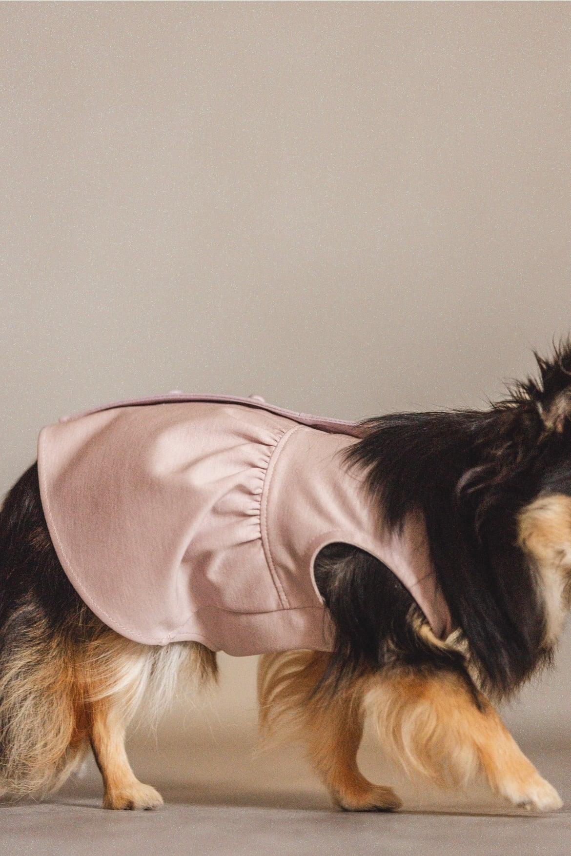 背側がすっと開くこの設計は、チワワの体に無理なく沿うためのもの。